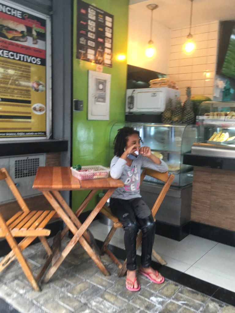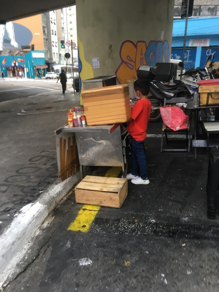 crianças sem máscaras trabalhando para seus pais, vendendo de balas a cachorro quente