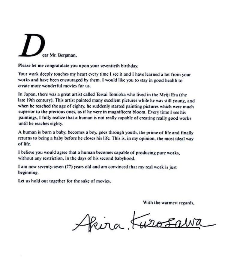 Em resposta a esta última afirmação, outro cineasta, o japonês Akira Kurosawa, enviou-lhe uma carta onde questionava este possível abandono e partilhava com Bergman algumas razões pelas quais acreditava ser preciso pensar duas vezes antes de deixar a sua carreira cinematográfica para trás.