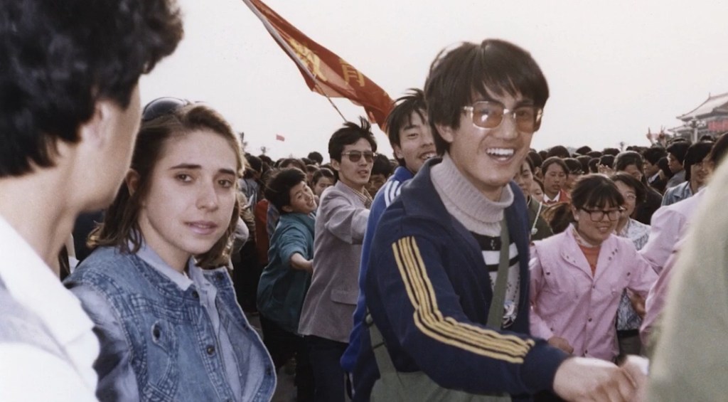 As filhas Raquel e Andrea com os colegas da escola para chinesesRaquel com os estudantes da Praça da Paz Celestial durante as manifestações que resultaram no massacre de 1989